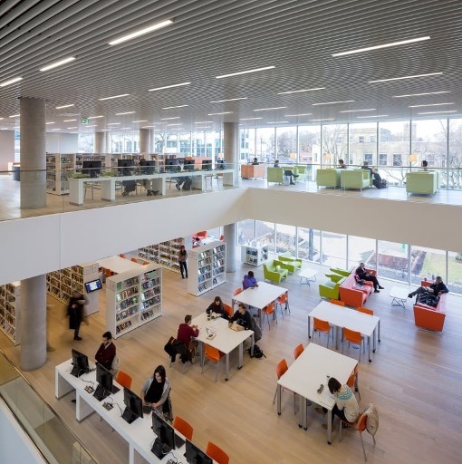 Caption: Many individuals use the available desks, couches, and computers across two floors of the Halifax libraries. The space is wide open with large windows and high ceilings.